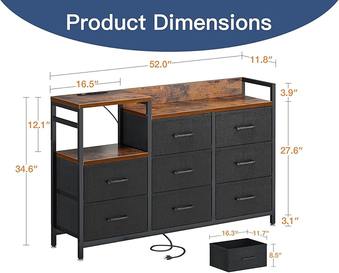 Casaottima Dresser for Bedroom with Charging Station, 52″ Long Dresser with 8 Storage Drawers, Large Fabric Dressers Chests of Drawers with Shelves, Black and Vintage